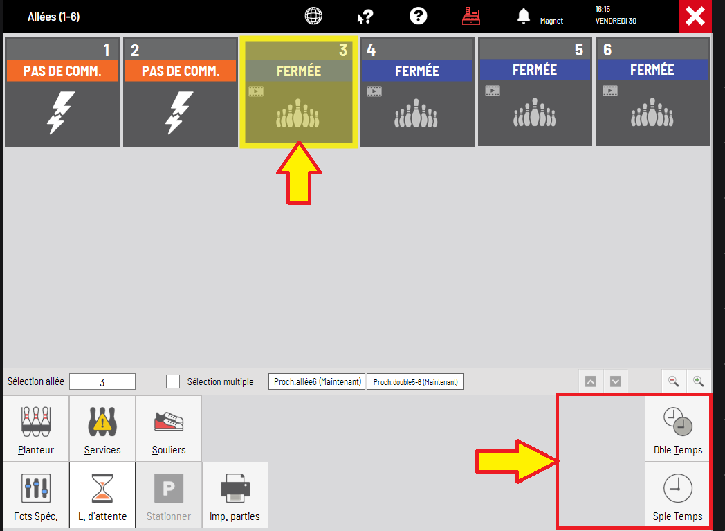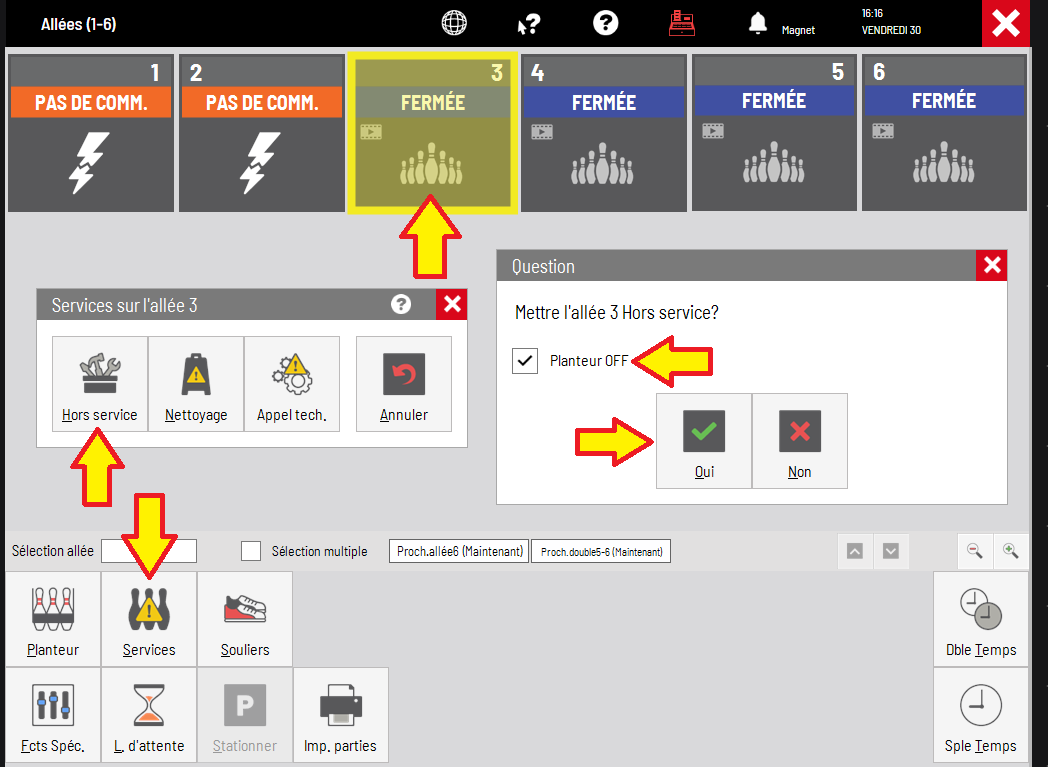 Définition : This function disables a lane from being open while being fixed by the mechanic. When seeing that the lane is under the workshop mode, the employee at the front desk must pay attention and get the green light from the mechanic to restore the lane and rent it. Never assume that no one is out there because you hear nothing. The mechanic may be looking for a part, analysing the issue or just working quietly. This is a very important safety measure.